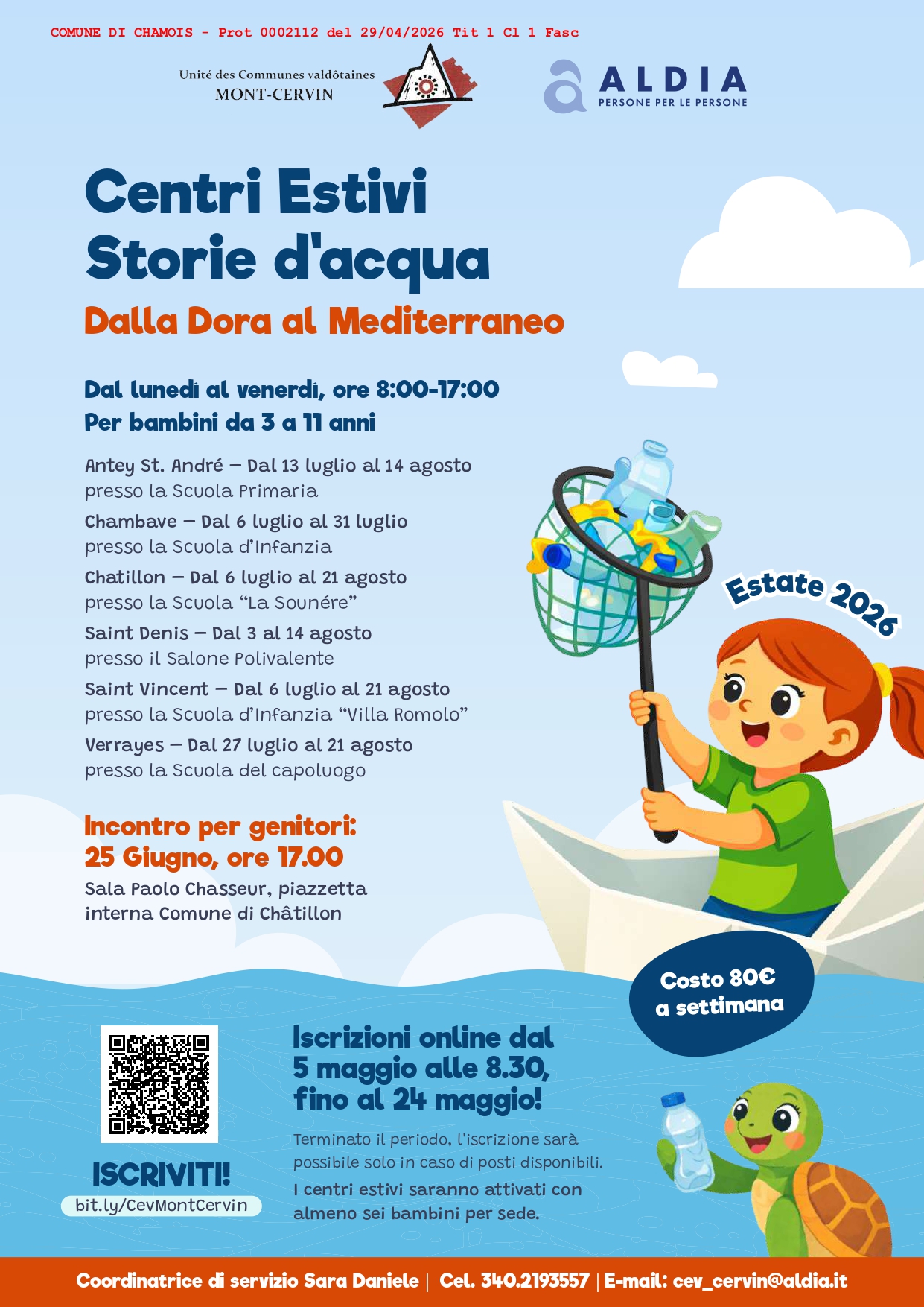 Dal lunedì al venerdì, ore 8:00-17:00 Per bambini da 3 a 11 anni