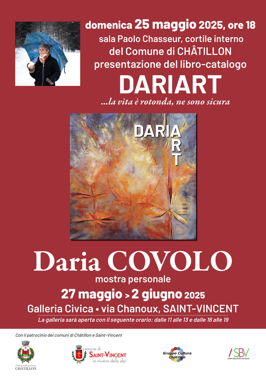 Il Gruppo Cultura di Châtillon, in collaborazione con l’Amministrazione comunale dei comuni di Châtillon e di Saint-Vincent, ha il piacere di segnalare la presentazione del libro-catalogo dell’artista Daria Covolo