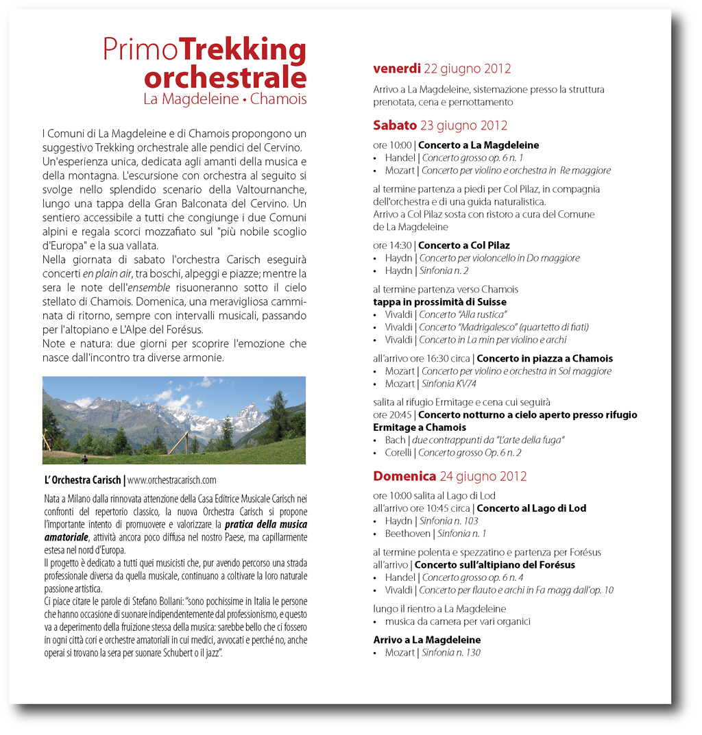 I COMUNI DI CHAMOIS E LA MAGDELIENE ORGANIZZANO UN SUGGESTIVO TREKKING ORCHESTRALE ALLE PENDICI DEL CERVINO PER I GIORNI 23 E 24 GIUGNO