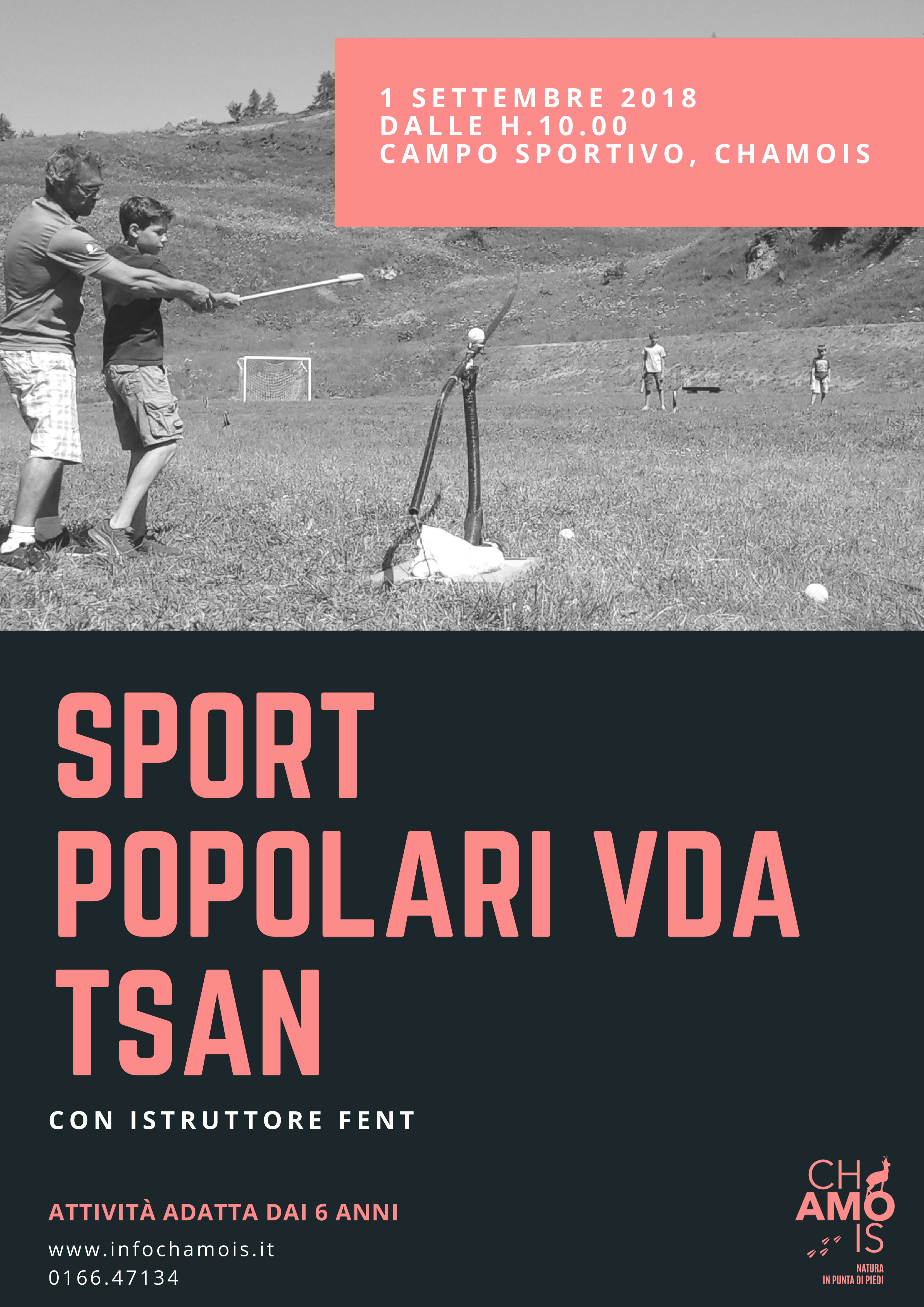 Sabato 1 settembre, dalle ore 10.00, presso il campo sportivo, un istruttore farà dimostrazioni e inviterà a prove pratiche degli sport tradizionali valdostani: tsan, palet, rebatta, fiolet. Adatto a adulti e bambini dai 6 anni.
