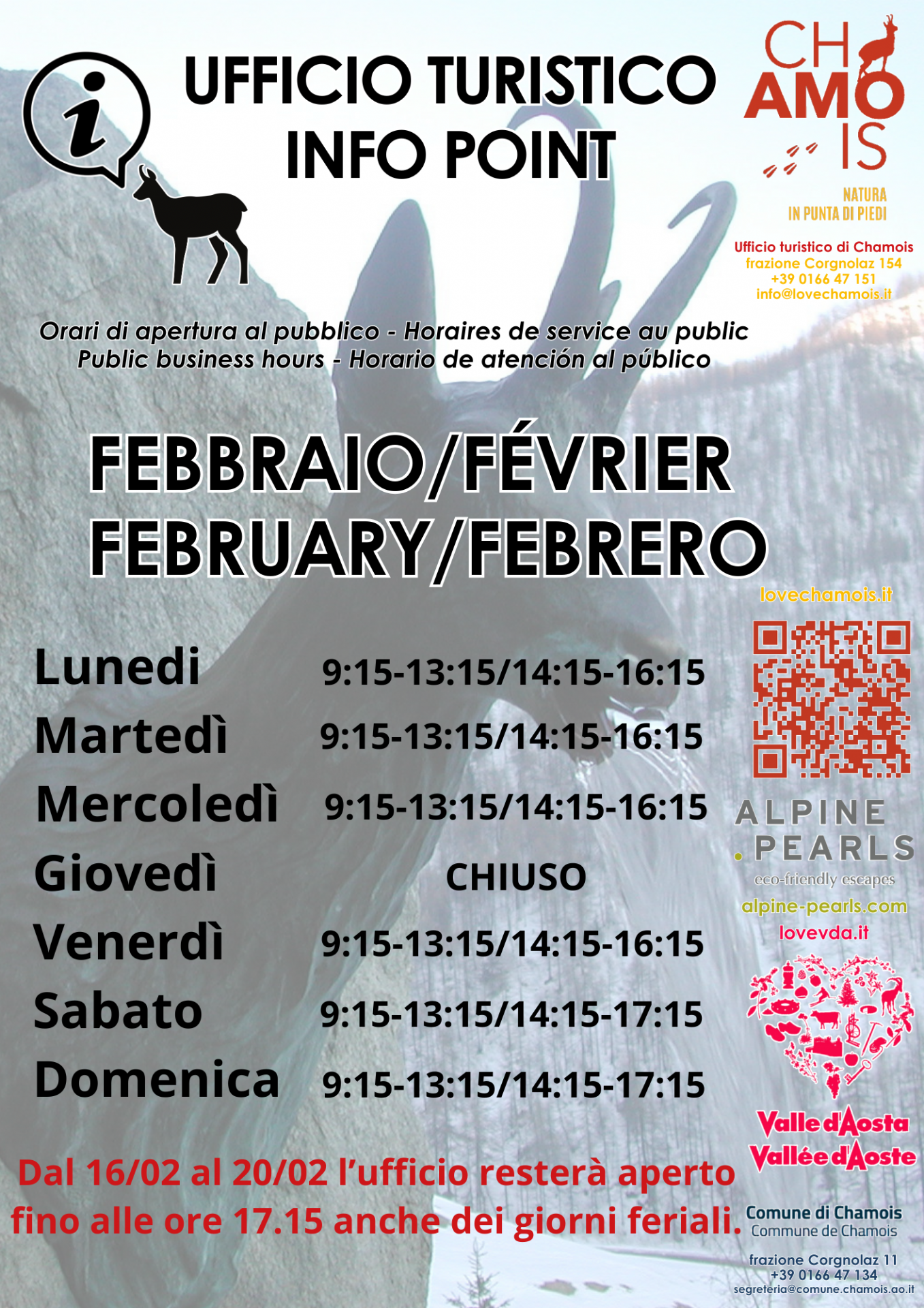Orari ufficio turistico mese di febbraio 2026.