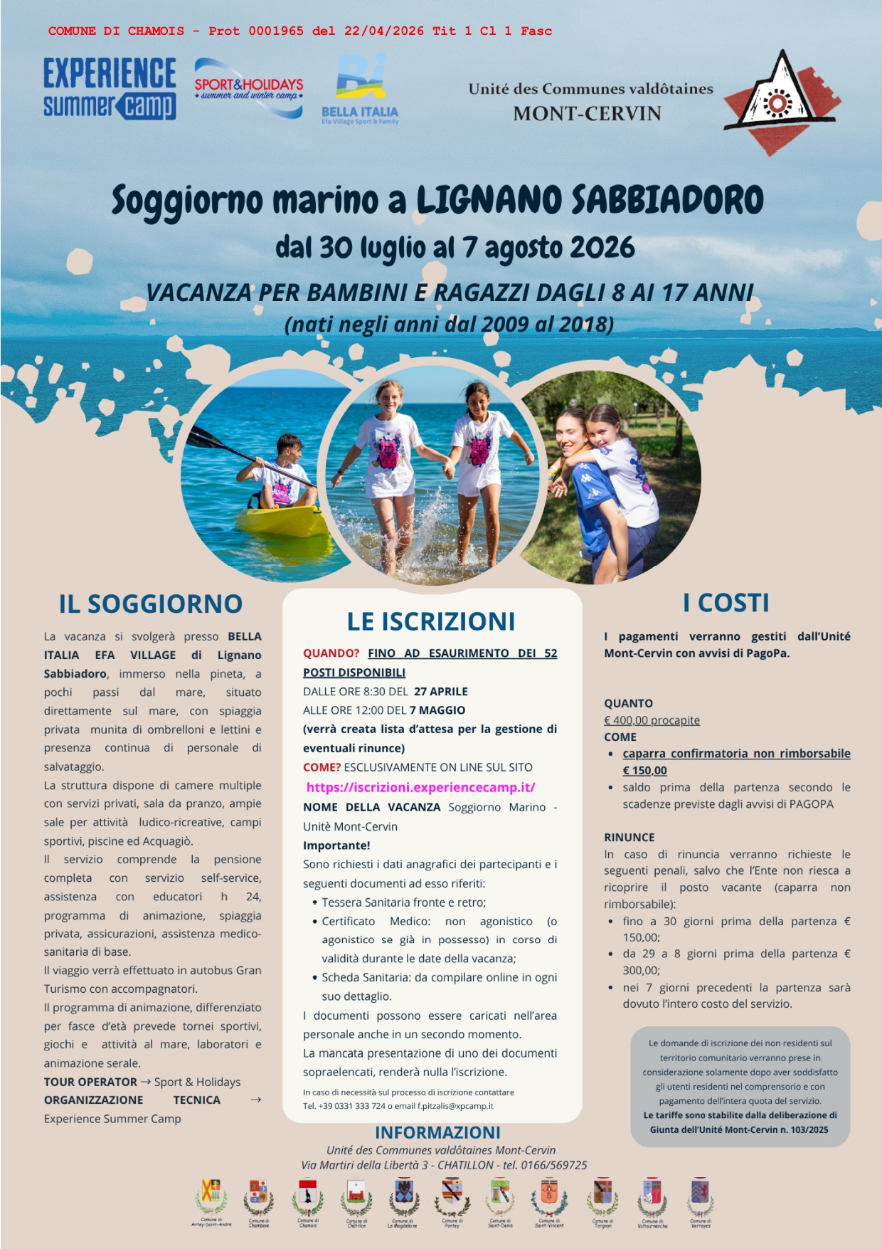 Le iscrizioni dovranno pervenire dalle ore 8:30 del 27 APRILE alle ore 12:00 del 7 MAGGIO esclusivamente ON LINE sul sito www.cm-montecervino.vda.it fino ad esaurimento dei 52 posti disponibili.