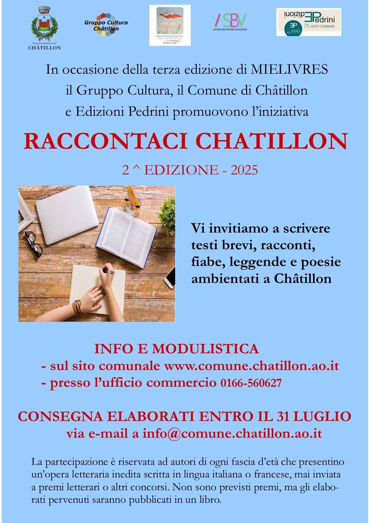 Il Gruppo Cultura in collaborazione con la Biblioteca, il Comune di Châtillon e la Edizioni Pedrini, promuove, in occasione della terza edizione del Festival Letterario “Mielivres Châtillon – Festival de la Nature et de l’Environnement”, che si terrà il 17-18-19 ottobre 2025, la partecipazione alla realizzazione di: testi brevi, racconti, novelle, fiabe, poesia, avventura, di genere: storico, gotico, per ragazzi, giallo, ambientale, fantasy, che devono essere obbligatoriamente ambientati nel Comune di Châtillon.