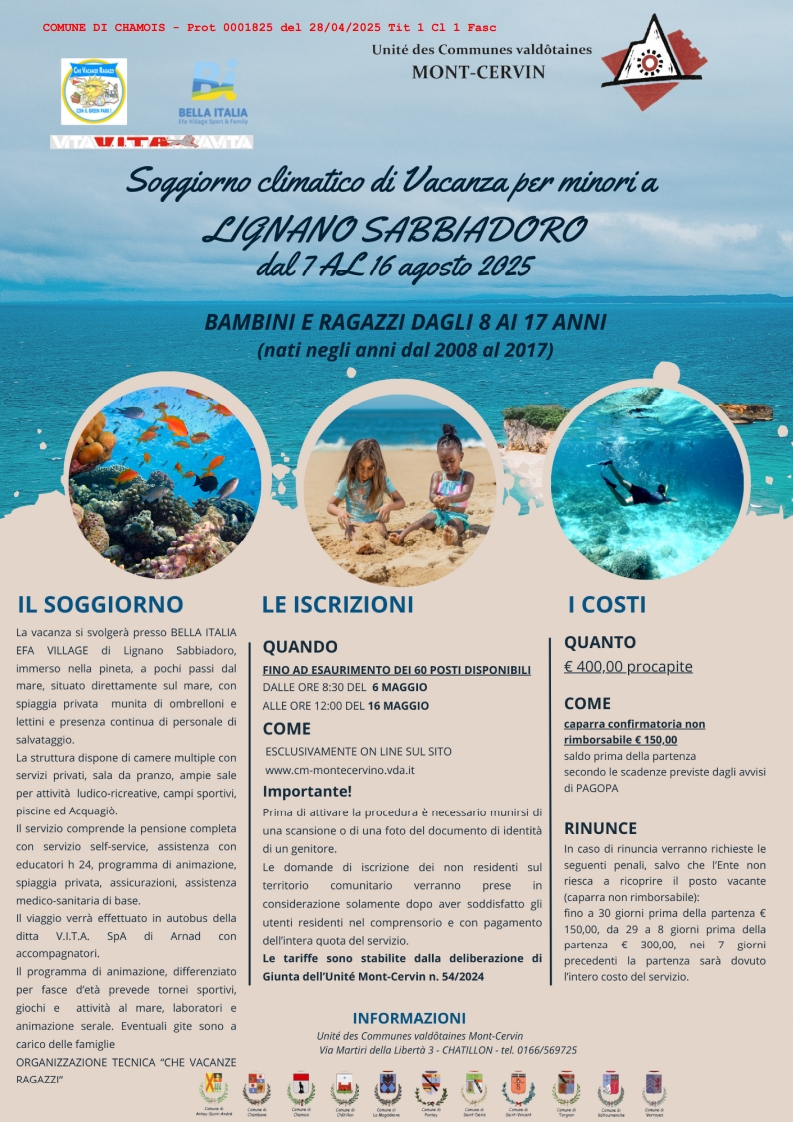 Le iscrizioni dovranno pervenire dalle ore 8:30 del 6 MAGGIO alle ore 12:00 del 16 MAGGIO esclusivamente ON LINE sul sito www.cm-montecervino.vda.it fino ad esaurimento dei 60 posti disponibili.